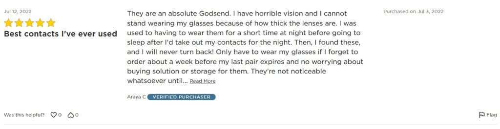 “The contacts are a God send for people with vision as awful as mine! I love not having to wake up and put on glasses or put in contacts every single morning just so I can see more than blurs of color. They’re comfortable, extremely breathable, and the price is amazing. They don’t dry out, even when Im just waking up. I often forget I’m even wearing contacts with these, which is incredible. I absolutely love these. I’ve been wearing them for years, though I’ll occasionally get a pair that I do have to take out at night or wear my glasses for a week or 2 just to give my eyes a break from constant wear.”