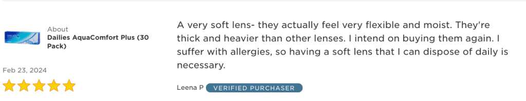 “A very soft lens—they actually feel very flexible and moist. They’re thick and heavier than other lenses. I intend on buying them again. I suffer with allergies, so having a soft lens that I can dispose of daily is necessary.”