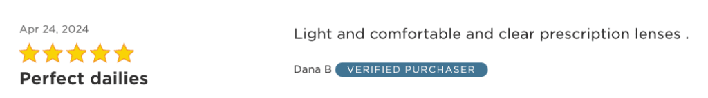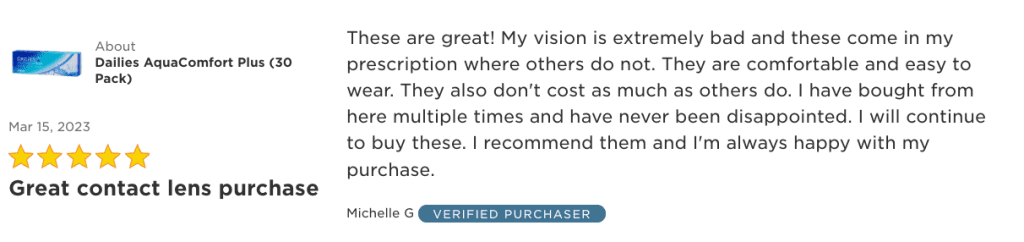 “These are great! My vision is extremely bad and these come in my prescription where others do not. They are comfortable and easy to wear. They also don’t cost as much as others do. I have bought from here multiple times and have never been disappointed. I will continue to buy these. I recommend them and I’m always happy with my purchase.”