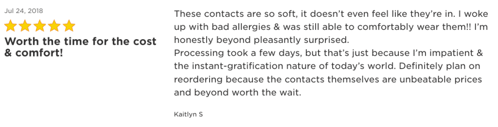 “These contacts are so soft, it doesn’t even feel like they’re in. I woke up with bad allergies & was still able to comfortably wear them!! I’m honestly beyond pleasantly surprised. Processing took a few days, but that’s just because I’m impatient & the instant-gratification nature of today’s world. Definitely plan on reordering because the contacts themselves are unbeatable prices and beyond worth the wait.”