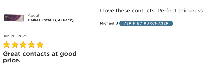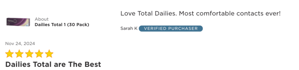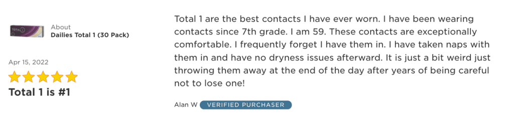 “Total 1 are the best contacts I have ever worn. I have been wearing contacts since 7th grade. I am 59. These contacts are exceptionally comfortable. I frequently forget I have them in. I have taken naps with them in and have no dryness issues afterward. It is just a bit weird just throwing them away at the end of the day after years of being careful not to lose one!”