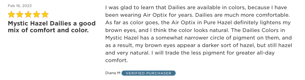 “I was glad to learn that Dailies are available in colors, because I have been wearing Air Optix for years. Dailies are much more comfortable. As far as color goes, the Air Optix in Pure Hazel definitely lightens my brown eyes, and I think the color looks natural. The Dailies Colors in Mystic Hazel has a somewhat narrower circle of pigment on them, and as a result, my brown eyes appear a darker sort of hazel, but still hazel and very natural. I will trade the less pigment for greater all-day comfort.”