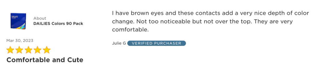 “I have brown eyes and these contacts add a very nice depth of color change. Not too noticeable but not over the top. They are very comfortable.”