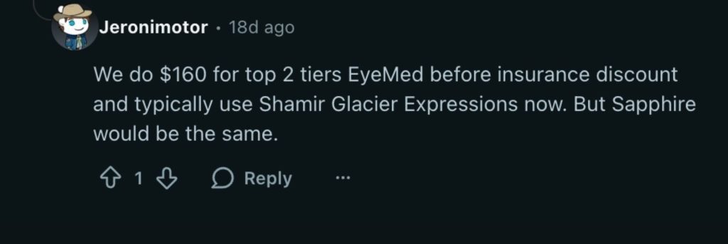 “We do $160 for top 2 EyeMed before insurance discount and typically use Shamir Glacier Expressions now. But Sapphire would be the same.”