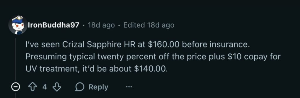 “I’ve seen Crizal Sapphire HR at $160.00 before insurance. Presuming typical twenty percent off the price plus $10 copay for UV treatment, it’d be about $140.”