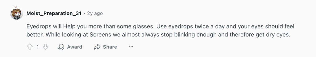 As one of our Redditors said, you can also use eye drops to reduce the dryness that comes with too much screen time.