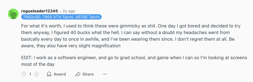 “For what it’s worth, I used to think these were gimmicky as shit. One day I got bored and decided to try them anyway, I figured 40 bucks what the hell. I can say without a doubt my headaches went from basically every day to once in awhile, and I’ve been wearing them since. I don’t regret them at all. Be aware, they also have very slight magnification