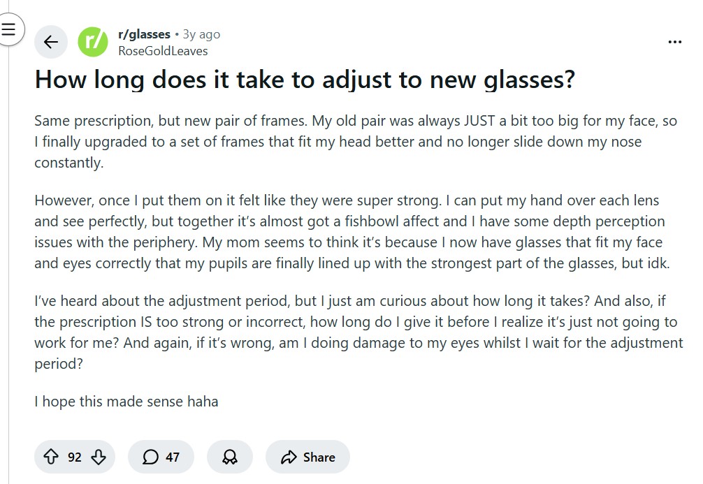 In a thread titled, “How long does it take to adjust to new glasses,” Redditor RoseGoldLeaves asked for advice. They wrote: