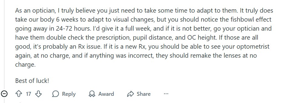 Other Redditors shared the issues they’d also had with their new glasses. They said this Reddit thread made them feel better. Distinct_Reply_8984 wrote: