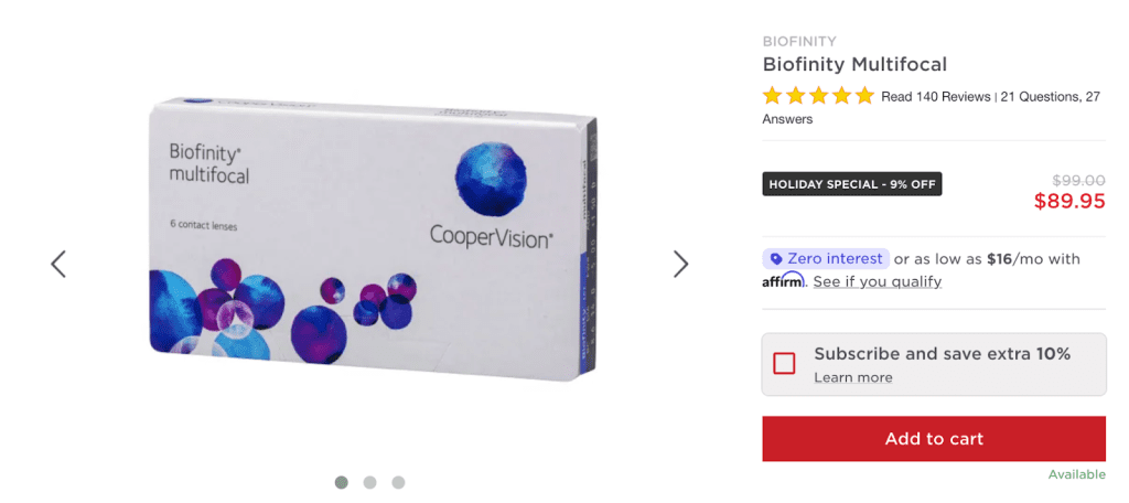 A box of six Biofinity Multifocal contacts costs $89.95.