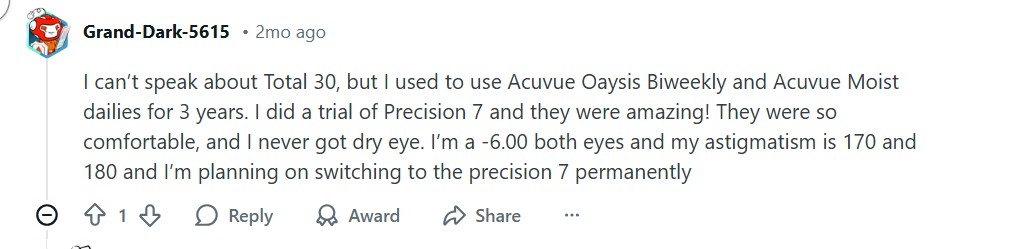 • A Reddit user asked for help deciding between PRECISION7 and TOTAL30 toric contact lenses. Many users were on team PRECISION7, saying they found the contacts to be more stable. However, some users also shared that Total30 worked well for them.