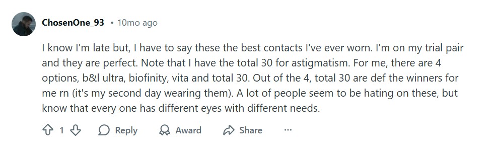 “I know I’m late but, I have to say these the best contacts I’ve ever worn. I’m on my trial pair and they are perfect. Note that I have the total 30 for astigmatism. For me, there are 4 options, b&l ultra, biofinity, vita and total 30. Out of the 4, total 30 are def the winners for me rn (it’s my second day wearing them). A lot of people seem to be hating on these, but know that every one has different eyes with different needs.”