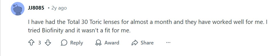 “I have had the Total 30 Toric lenses for almost a month and they have worked well for me. I tried Biofinity and it wasn’t a fit for me.”