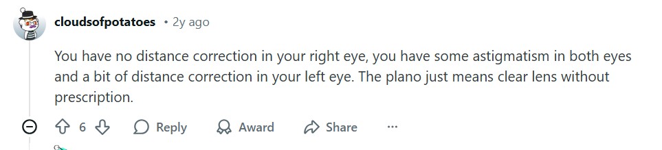 Spookyxsam shared their prescription, which had plano written in the ‘SPH’ section for the right lens. However, Spookyxsam did have measurements in the CYL and Axis columns. Another user responded and explained: